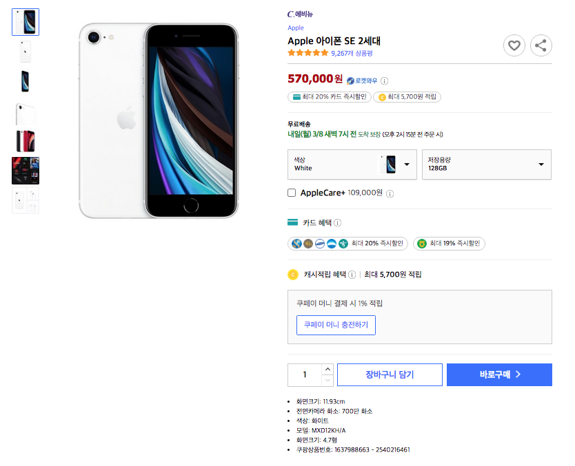 아이폰SE 2세대 128GB 모델은 기본 가격이 570,000으로 되어 있습니다. 애플스토어 가격이 620,000원이니 기본 5만원이 저렴하게 책정되어 있습니다. 그리고 카드 할인은 최대 20%를 지원합니다.