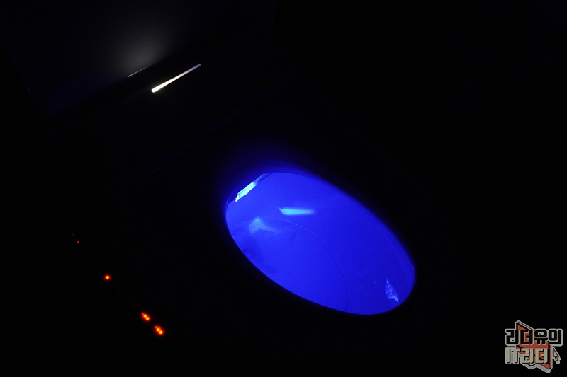첫번째로 고민하는 노즐 같은 경우는 UV와 전해수 살균으로 안심하고 사용할 수 있게 했고 물이 들어오는 유로, 물통도 전해수 살균으로 위생 문제를 해결했습니다. UV 램프가 작동중일때는 이렇게 파란불이 나오는 것을 알 수 있습니다.