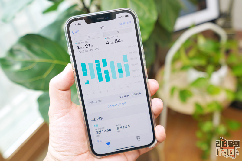 아이폰 건강앱에 가면 수면 메뉴를 볼 수 있습니다. 수면 시간을 설정해 두면 주, 월 별 단위로 기록된 수면 정보를 볼 수 있게 됩니다. 참고로 수면 추적 관리는 애플워치가 있어야 가능한 기능입니다.