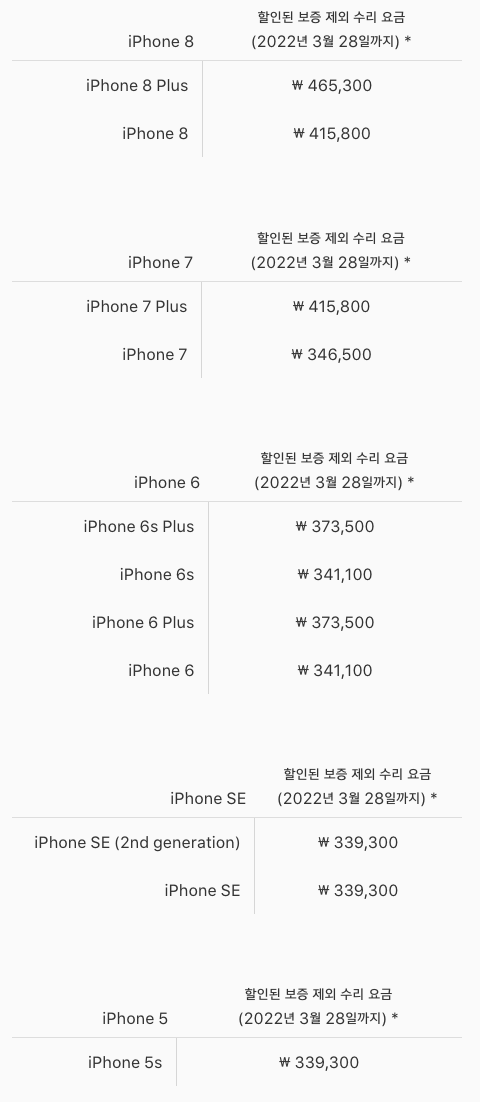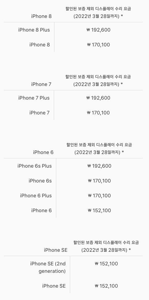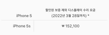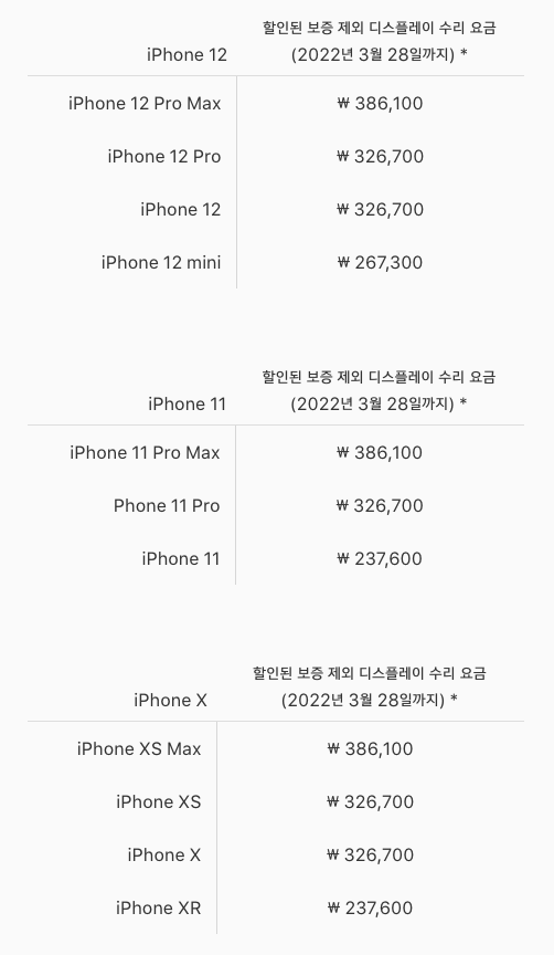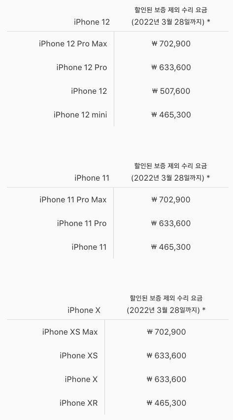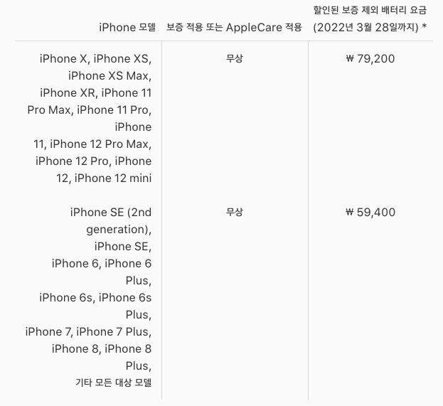 애플이나 공인 서비스 제공업체, 아이폰 이동통신사에서 2021년 3월 29일부터 2022년 3월 28일까지 아이폰 보증 제외 서비스 관련 디스플레이, 배터리 및 기타 수리에 대해 10% 할인 혜택을 제공합니다.