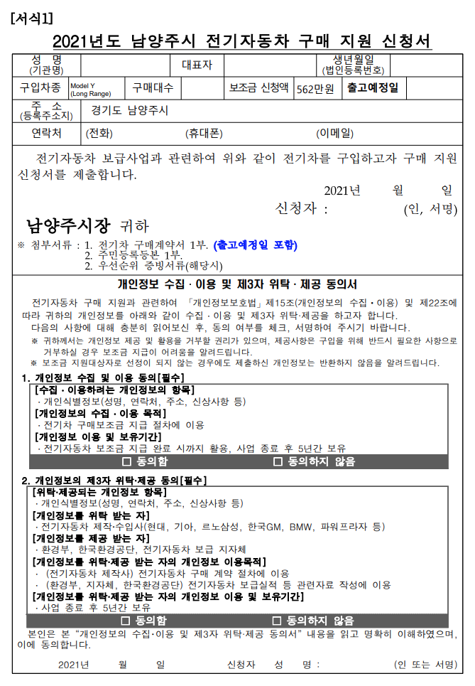 먼저 전기자동차 구매 지원 신청서를 작성합니다. 이건 테슬라에서 보내주니 해당 항목에 기입하면 됩니다.
