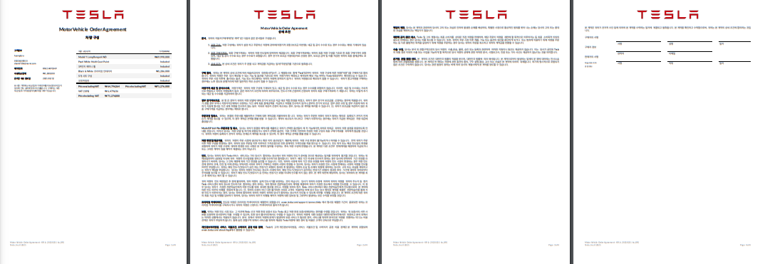 그리고 차량 구매계약서를 출력해서 같이 보내야 합니다. 테슬라 홈페이지 가서 로그인하고 관리에 들어갑니다. 오른쪽 하단에 구매계약서 보기가 있습니다. 해당 서류를 출력해서 마지막 페이지에 서명과 성함을 써서 보내면 됩니다.