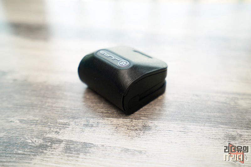 충전 케이스의 경우는 인조 가죽을 사용해 고급스러움을 주고 있고 전면에는 JAB 브랜드를 강조해서 보여주고 있습니다. 브랜드에 대한 자신감을 느낄 수 있는 포인트 입니다. 그리고 앞쪽에는 현재 배터리 상태를 알 수 있는 LED 램프가 있습니다.