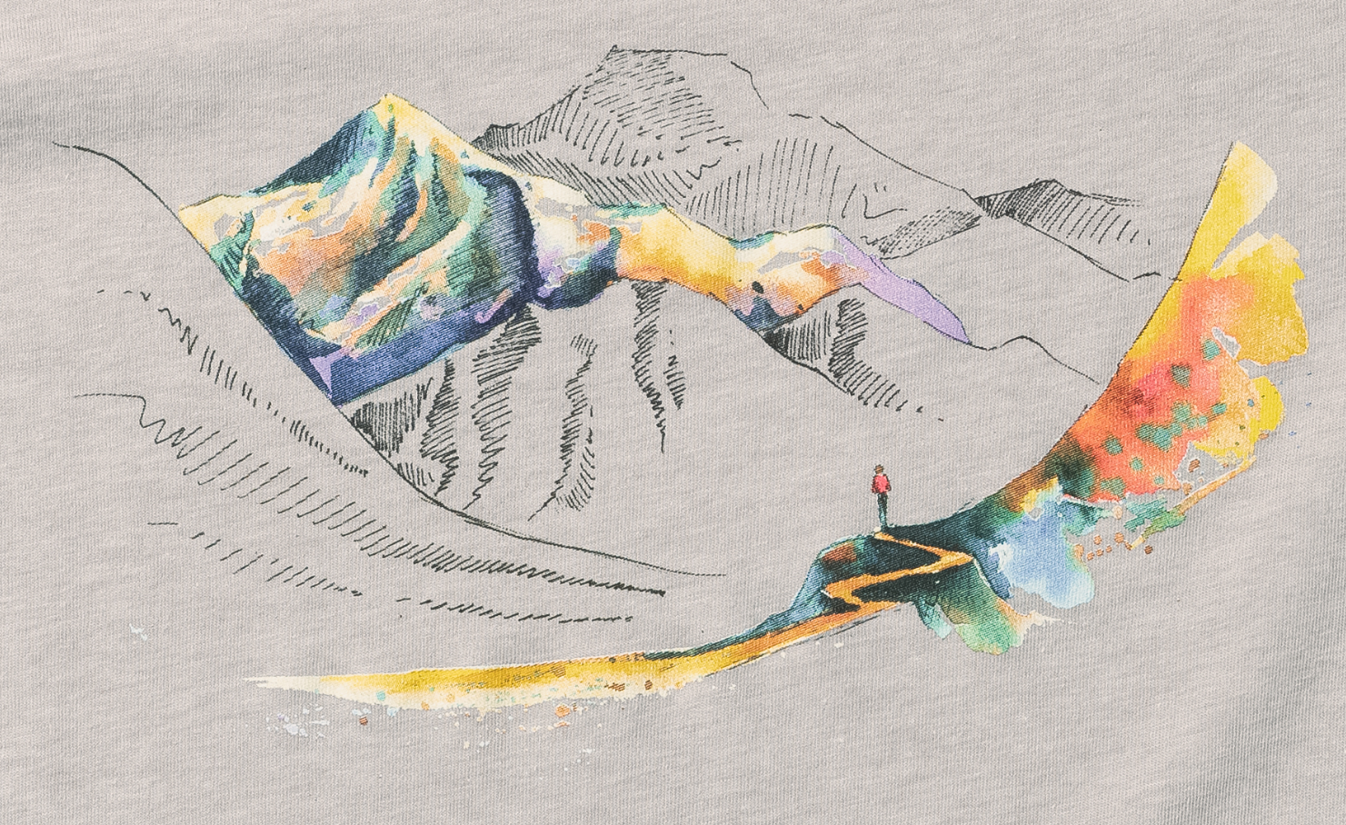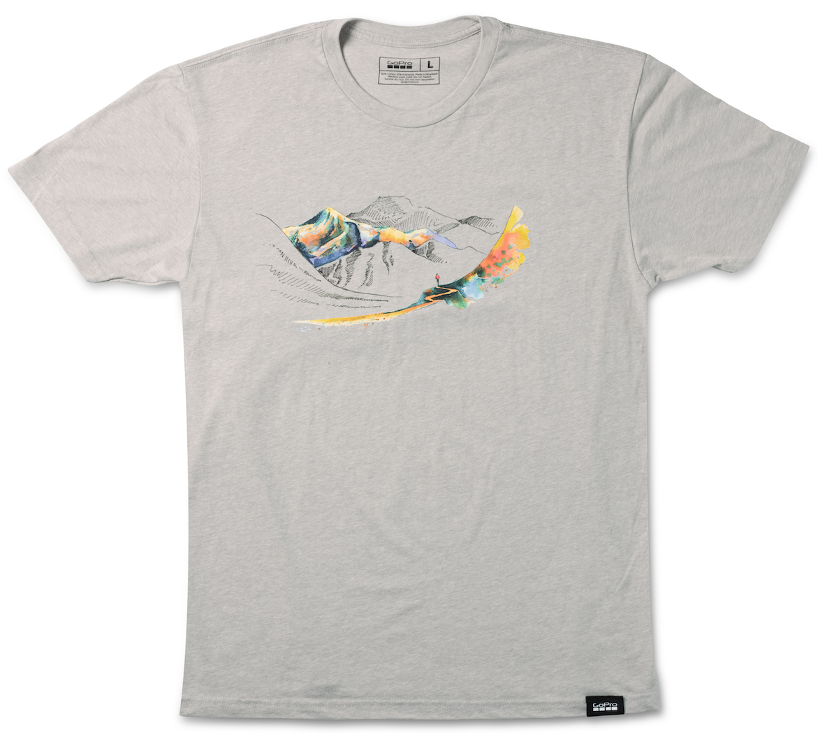 고프로 엘리베이션 그래픽 티셔츠 입니다. 알래스카 트레일 아티스트 겸 고프로 밀리언 달러 챌린지 우승자 맥스 로미가 디자인한 한정판 티셔츠 입니다. 맥스 로미가 직접 그린 산맥 수채화가 티셔츠 전면에 프린트되어 있는데요. 아티스트의 지속적인 환경 보호 노력을 지원하고자 티셔츠 수익금의 10%는 환경 보존 단체 프로덱트 아워 원터에 기부됩니다.