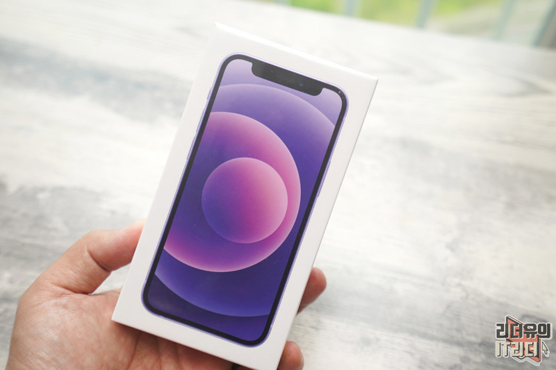 아이폰12 미니 패키지 입니다. 퍼플 컬러를 통해 아이폰12 미니 퍼플 색상임을 보여주고 있습니다. 참고로 애플은 각 색상별로 패키지가 준비되는 섬세한 패키징을 보여주고 있습니다.