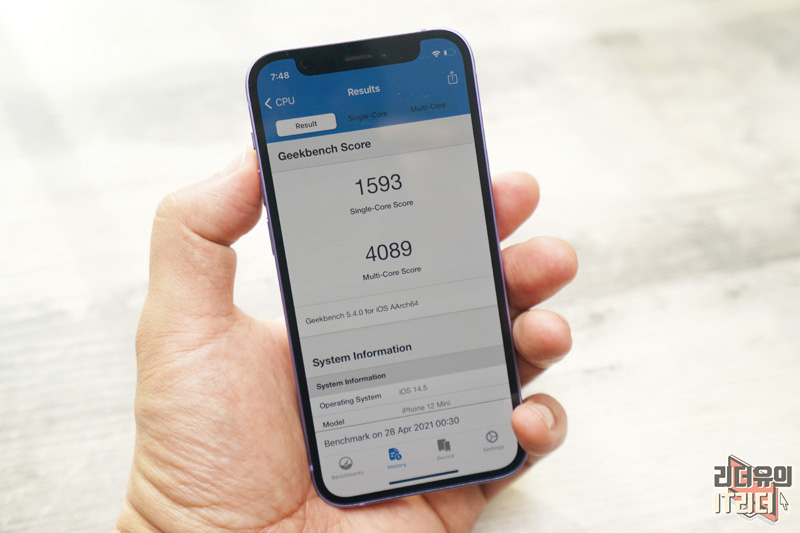 아이폰12 미니 긱벤치 5 싱글코어 점수는 1,593점, 멀티코어 점수는 4,089점 입니다.