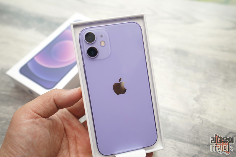 아이폰12 미니 패키지 입니다. 퍼플 컬러를 통해 아이폰12 미니 퍼플 색상임을 보여주고 있습니다. 참고로 애플은 각 색상별로 패키지가 준비되는 섬세한 패키징을 보여주고 있습니다.