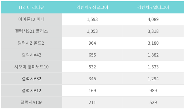 긱벤치5는 점수는 높을수록 좋습니다. 최근 갤럭시 A32, 갤럭시 A42 가성비 좋다고 좋은 평가를 받았는데요. 점수 차이를 보면 아이폰12 미니가 얼마나 고성능인지 아실 수 있으실 겁니다.