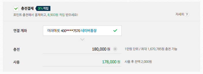 그리고 결제 수단 보면 네이버 포인트 결제가 있습니다. 충전에서 결제하면 더 적립을 해주는 구조입니다. 연결계좌가 네이버통장으로 되어 있으면 8,900원까지 적립을 받을 수 있습니다.