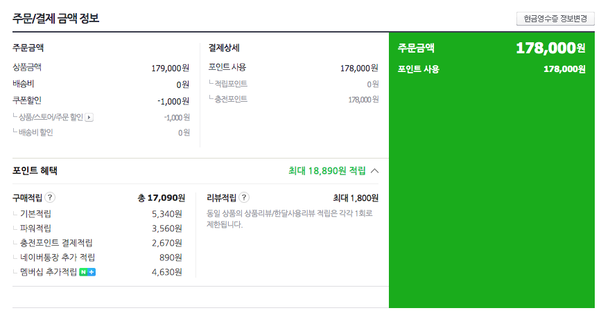 쿠폰 할인이 있어서 1000원 할인 받았고 네이버페이 기본적립 5,340원, 파워 적립 3,560원, 충전포인트 결제 적립 2,670원, 네이버통장 추가 적립 890원 네이버 플러스 멤버십 추가 적립 4,630원 해서 총 17,090원 할인을 받았습니다. 대박이죠.
