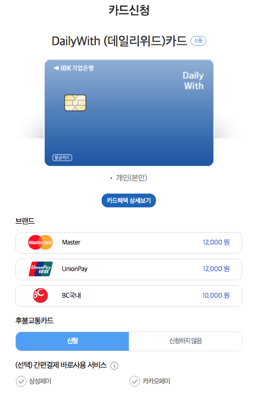 카드 발급시에 보면 마스터, 유니온페이, BC국내를 선택할 수 있습니다. 마스터카드가 연회비가 엄청 비싸거나 발급이 어려운 건 아니니 부쉽게 발급 받을 수 있습니다.