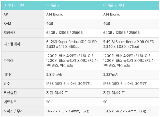 아이폰12, 아이폰12 미니 스펙 비교 입니다. 참고로 RAM이 4GB라 작은거 아니냐? 이런 우려를 표하실 수 있지만 iOS는 RAM 용량을 많이 요구하지 않기 때문에 여유로운 사용을 할 수 있습니다. 그래서 아이폰의 경우 RAM 용량을 따로 공개하지는 않습니다. 보이는게 다가 아니기 때문입니다. 그리고 배터리 용량도 다른 안드로이드폰에 비하면 작은 용량이지만 배터리 관리 기술이 뛰어나 오랜 사용시간을 경험할 수 있습니다. 물론 아이폰12 미니는 배터리 용량이 작기 때문에 상대적으로 사용 시간은 짧습니다.