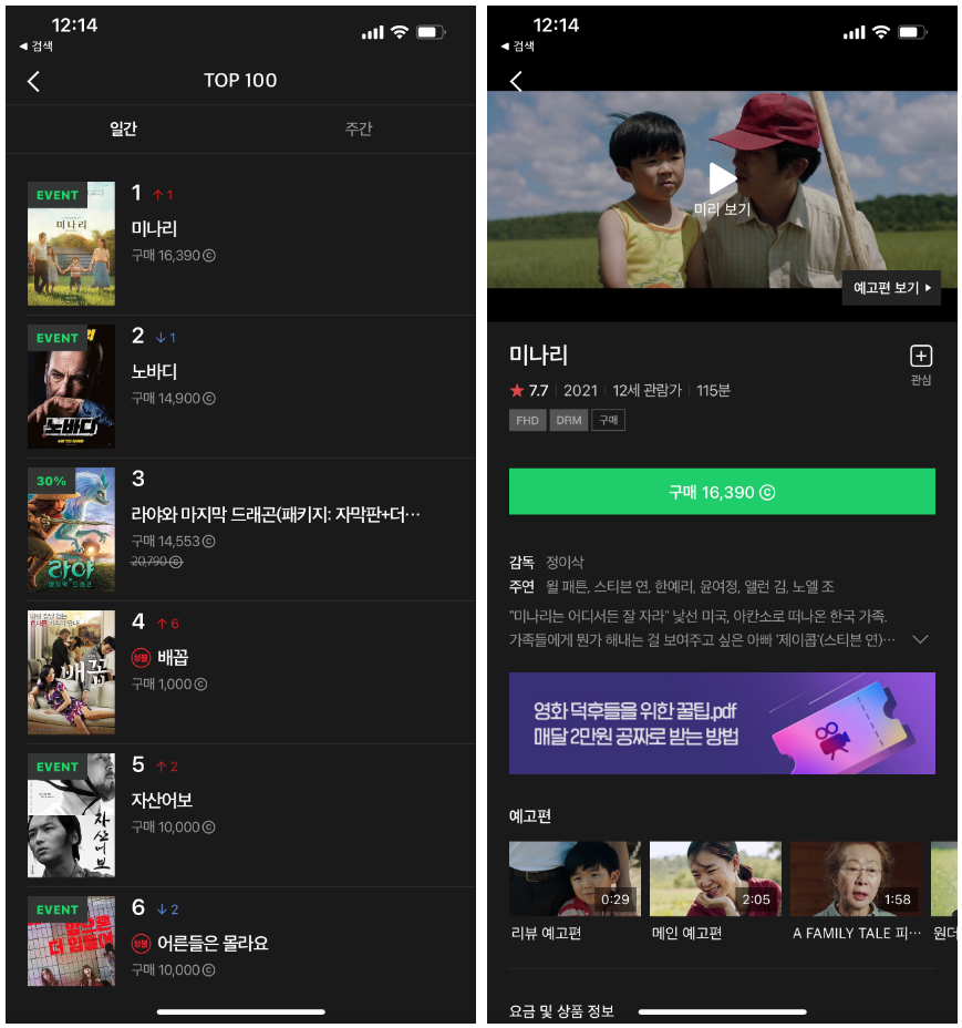 즉, 지금 네이버 플러스 멤버십을 무료 가입하고 네이버 시리즈온 영화를 선택하면 미나리 영화를 볼 수 있습니다.