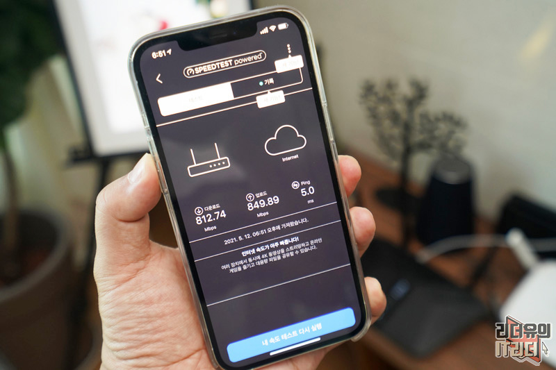 속도 체크를 해보니 다운로드 51.9Mbps, 업로드 21.1Mbps 입니다. 기존 공유기는 아예 안되는 곳에서도 이렇게 놀라운 속도를 내주고 있습니다. 공유기 하나로 완벽한 커버를 할 수 있음을 알 수 있습니다. 비싼 만큼 제값을 하고 있습니다.