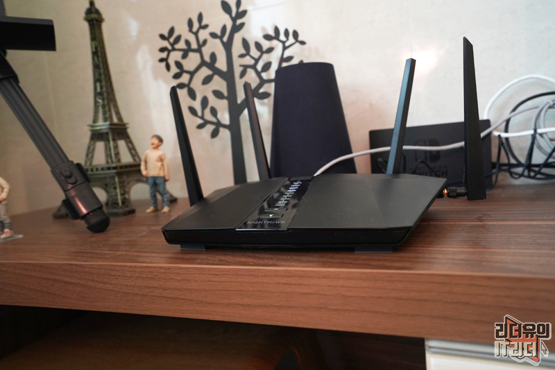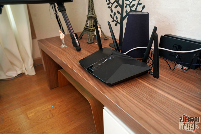 넷기어 나이트호크 RAX50 외장안테나를 장착한 모습입니다. 2.4GHz, 5GHz 를 지원하고 통합 최대 5.4Gbps (600 + 4800Mbps)의 빠른 무선 속도를 지원하고 있습니다.