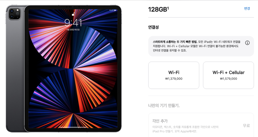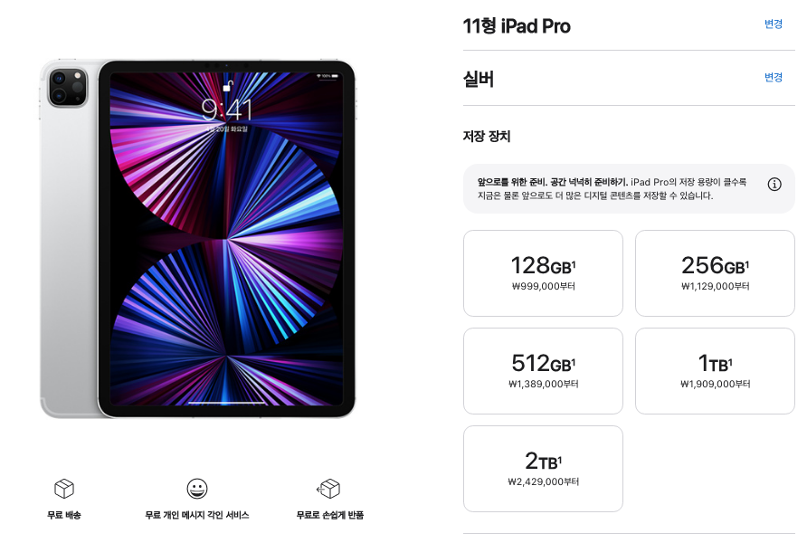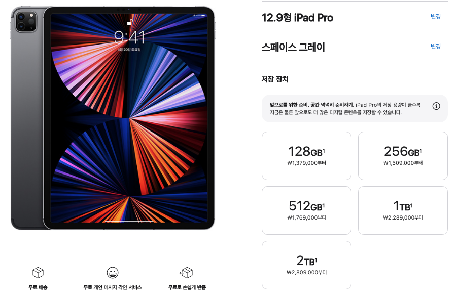 아이패드 프로 5세대 12.9형도 용량 선택은 똑같습니다. 2TB 까지 가면 가격이 2,809,000원까지 올라가네요. 맥북프로 가격까지 가는 수준입니다.