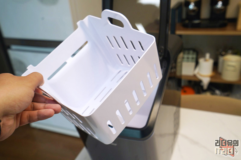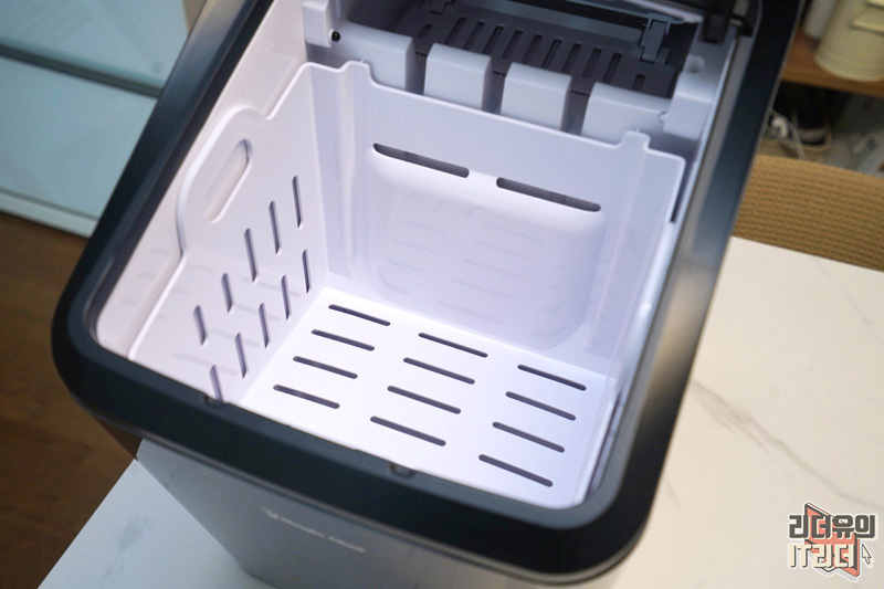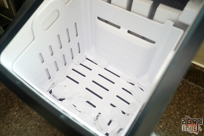 얼음 바스켓이 장착되어 있는데요. 얼음이 만들어지면 여기에 모이게 됩니다. 그리고 아래쪽에 구멍이 뚫려 있죠. 얼음을 만들어 두고 사용안하면 다시 녹겠죠. 그럼 아래 물로 들어가 언제든지 얼음을 만들 수 있습니다. 바스켓 용량은 1.8kg 입니다.