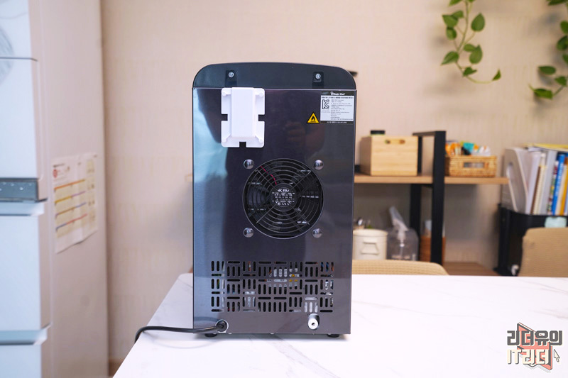매직쉐프 매직쿨 제빙기 후면 모습입니다. 컴퓨터 팬 같은게 보이죠. 열을 효율적으로 빼내는데요. 소음은 40~50dB (조용한 도서관 )정도 됩니다. 업계 최저 소음 수준입니다. 참고로 처음 작동시에는 소음이 조금 큰데요. 작동이 되면 조용해 지니 소음 걱정 없이 사용할 수 있습니다.
