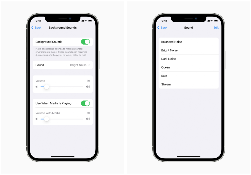 애플은 일상 속 다양한 사운드는 주의를 분산시키고, 듣는 사람을 불편하게 하거나 너무 압도적일 수 있기 때문에 신경다양성을 지원하기 위해 주의력 분산을 최소화하고 사용자들이 집중하고, 차분함을 유지하고, 휴식을 취할 수 있도록 도와주는 새로운 배경 사운드를 선보일 예정입니다. 밸런스드 노이즈, 브라이트 또는 다크 노이즈, 바다, 비, 개울 소리가 배경에서 지속적으로 재생되면서 원치 않는 환경 또는 외부 소음을 희석시키고 다른 오디오 미치 시스템 사운드에 섞이거나 자연스럽게 묻혀 사라지게 된다고 합니다.