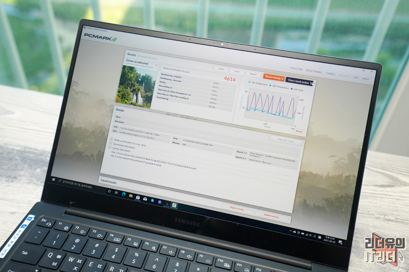 전체적인 성능 파악을 위해 벤치마크 PCMAKR8을 돌려 봤습니다. 점수가 4,614점으로 상당히 높게 나왔습니다. 슬림한 노트북에서 쉽게 볼 수 없는 점수라 할 수 있습니다.