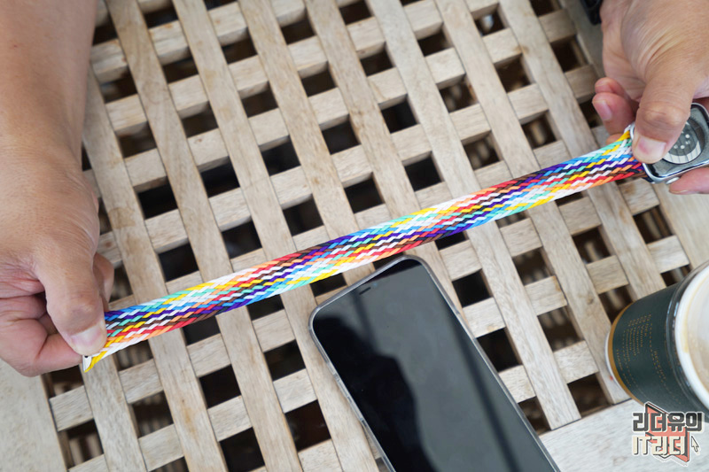 애플워치 프라이드 에디션 브레이드 솔로 루프는 프라이드 깃발을 구성하는 색깔들을 한데 엮어 만들었습니다. 색동 저고리 같은 한국적인 느낌도 드는데요. 정밀한 첨단 편조기를 사용해 16,000 가닥의 재활용 폴리에스테르 필라멘트사를 극세사 실리콘 스레드와 엮어 만들었습니다.