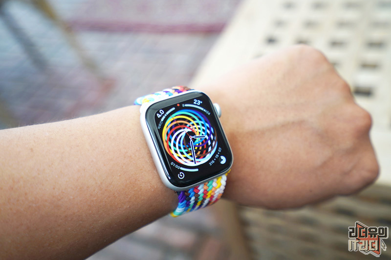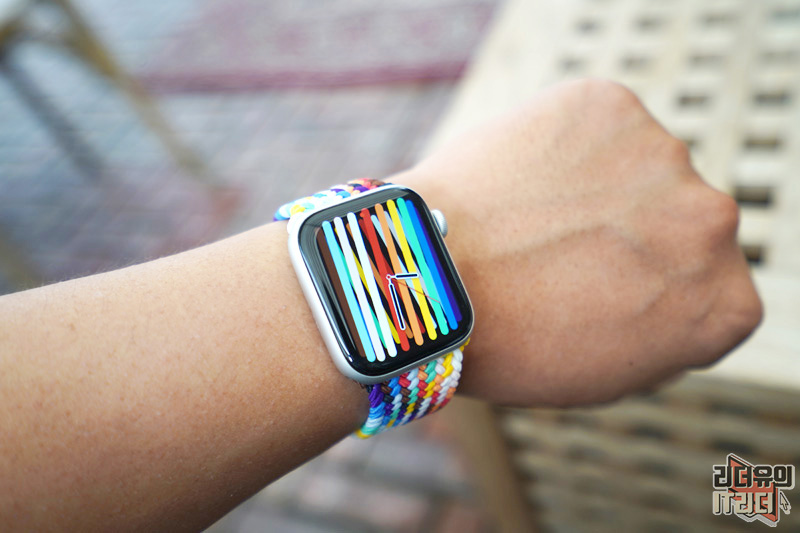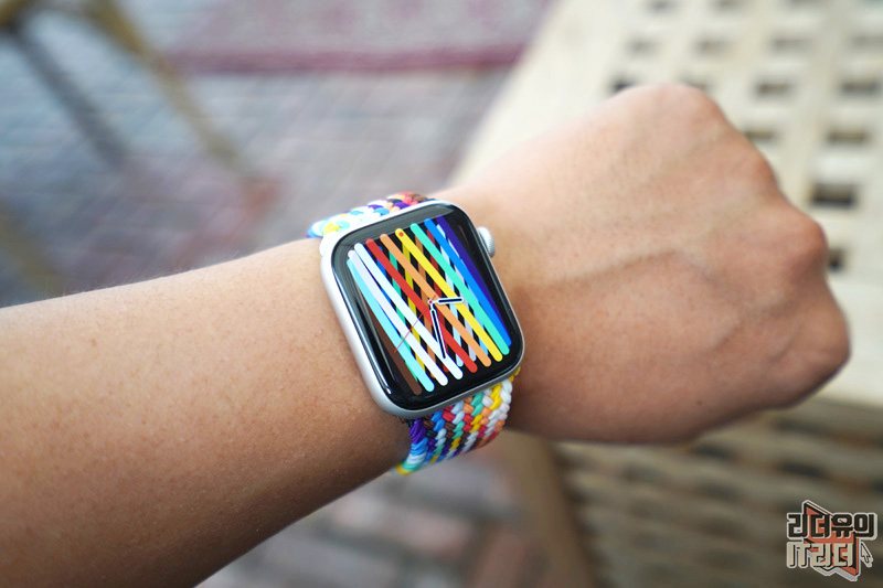 애플워치에 프라이드 에디션 브레이드 솔로 루프 밴드를 장착한 모습입니다. 화려하면서도 감각적인 디자인을 느낄 수 있습니다.