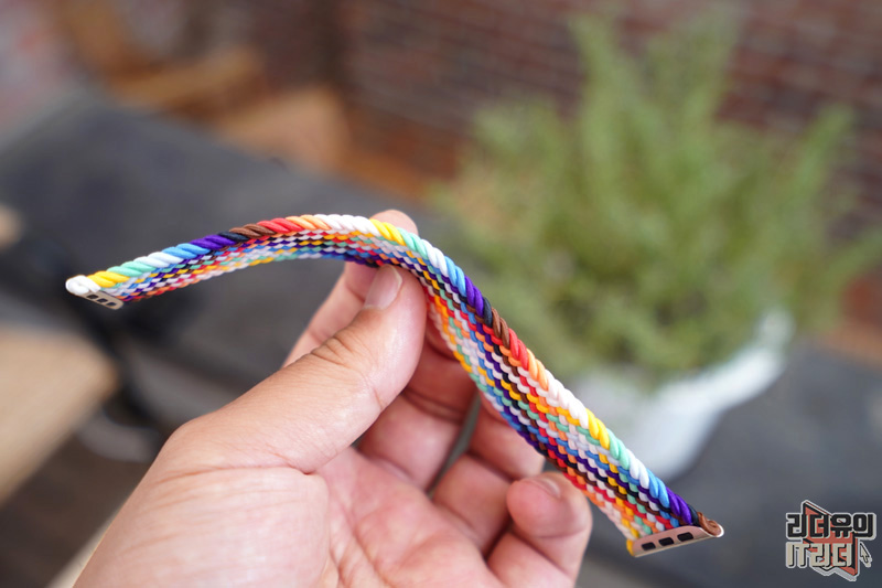 애플워치 프라이드 에디션 브레이드 솔로 루프는 프라이드 깃발을 구성하는 색깔들을 한데 엮어 만들었습니다. 색동 저고리 같은 한국적인 느낌도 드는데요. 정밀한 첨단 편조기를 사용해 16,000 가닥의 재활용 폴리에스테르 필라멘트사를 극세사 실리콘 스레드와 엮어 만들었습니다.