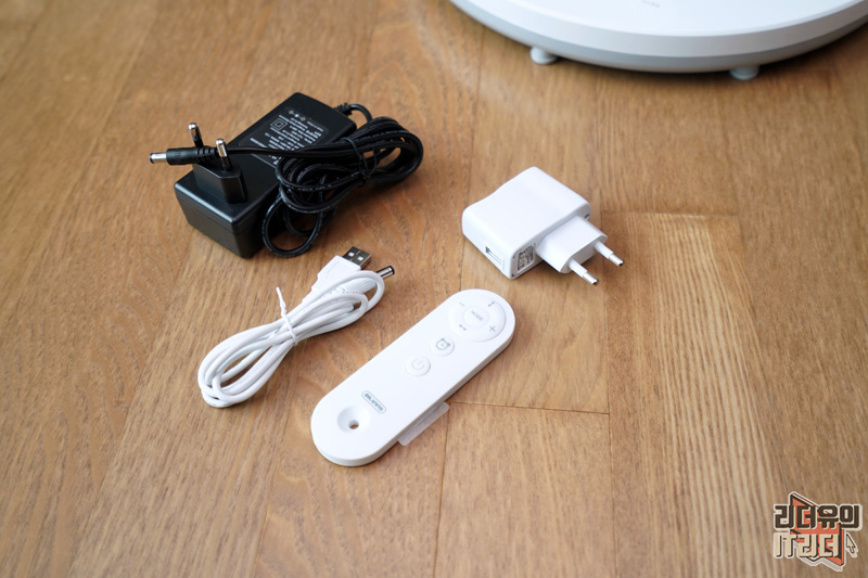 딜루비스 윈드프리 구성품은 선풍기 본체, 받침대, 어댑터 2개, 전원 케이블, 리모컨으로 구성되어 있습니다.