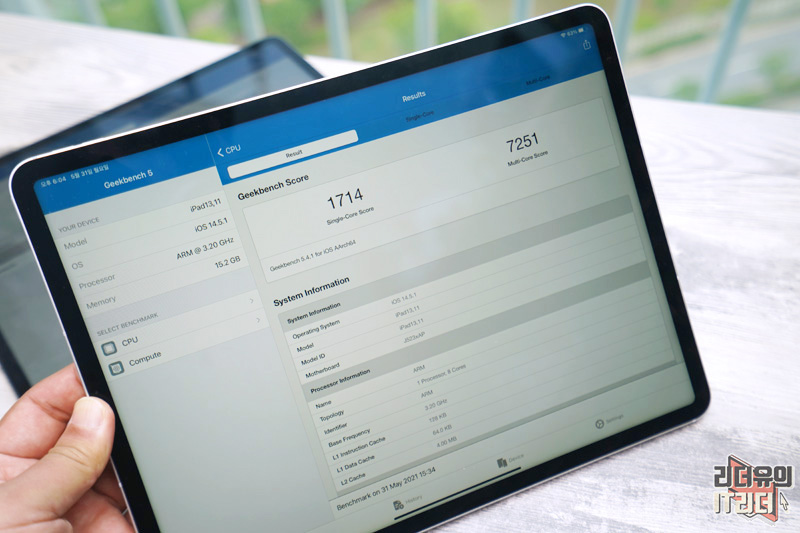 아이패드 프로 5세대 12.9형 긱벤치5 점수는 싱글코어 1714점, 멀티코어 7251점 입니다. 얼마나 좋은 점수인지 감이 안오시죠? 비교한 점수로 그 차이를 확인해 보시기 바랍니다.