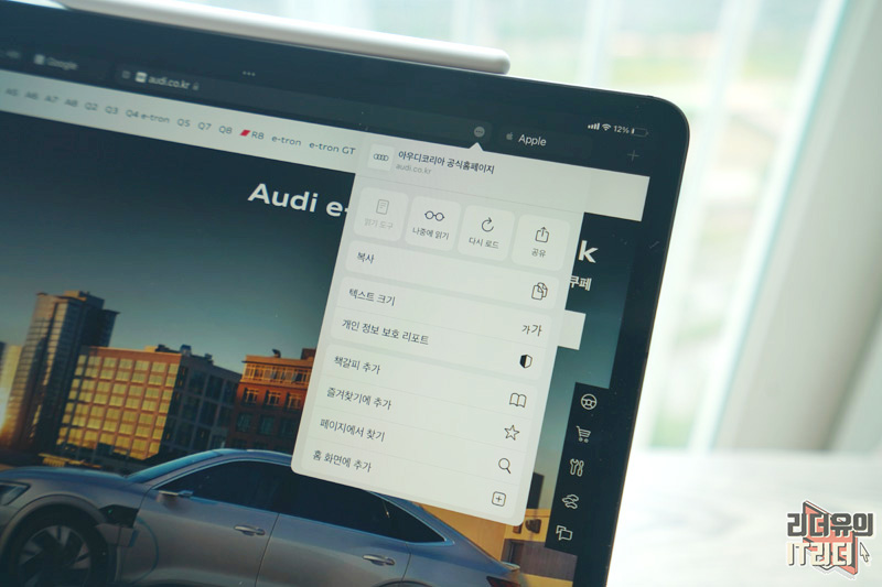 아이패드 사파리 주소창의 '...' 을 누르면 맥 사파리와는 다른 메뉴 구조를 확인할 수 있습니다. 아이패드는 나중에 읽기, 다시 로드, 공유 버튼을 넣어 놨고 아래쪽에 다양한 메뉴 배치를 통해 아이패드 만의 빠른 접근성을 보여주고 있습니다. 그리고 빠른 메모 기능도 추가 메뉴로 없습니다.