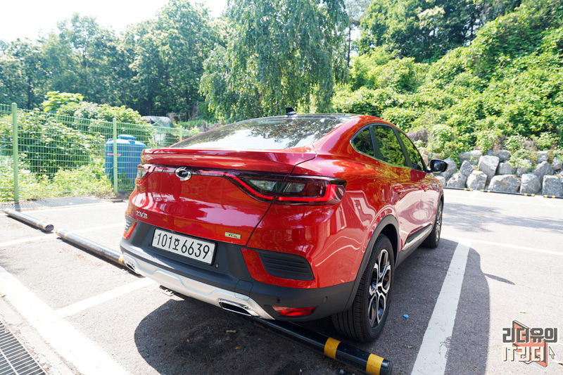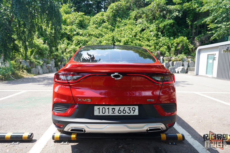 2022년형 르노삼성 XM3 소닉 레드 컬러 후면 모습입니다. 테일램프가 빨간색이라 색이 뭍힐것 같지만 전혀 그렇지 않습니다. 어둡게 처리된 테일램프 라인으로 수평적인 이미지를 잘 살리고 있고 샤프한 LED 라인이 스포티한 이미지를 주고 있습니다. 그리고 하단의 스키드는 전면과 마찬가지로 하이퍼 새틴 그레이 컬러를 적용해 확실히 포인트 되는 느낌을 주고 있습니다.