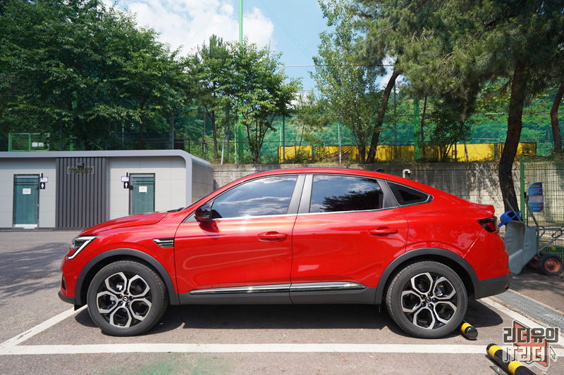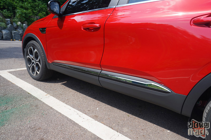 2022년형 르노삼성 XM3 옆모습에도 달라진 디자인 포인트가 있습니다. 크롬사이드 엠블리셔를 변경해 소닉 레드 컬러와 크롬의 조합을 느낄 수 있습니다. 작지만 포인트 되는 크롬이 전체적으로 레드 컬러를 더욱 잘 살려주고 있습니다.