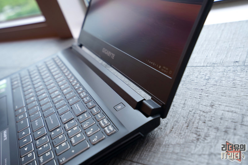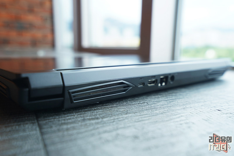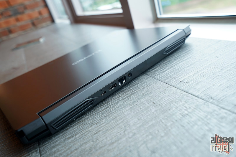 후면에는 USB3.2 Type-C Gen2 단자, HDMI 2.0 단자, RJ45 이더넷 단자, 전원 단자가 있습니다. 게임을 할 때 전원선 연결은 필수 이고 이더넷 단자도 한번 연결하면 계속 연결하고 있으니 선이 걸리지 않게 뒤쪽으로 배치한 것입니다. 이런 섬세한 배려 역시 기가바이트 노트북 다운 설계입니다.