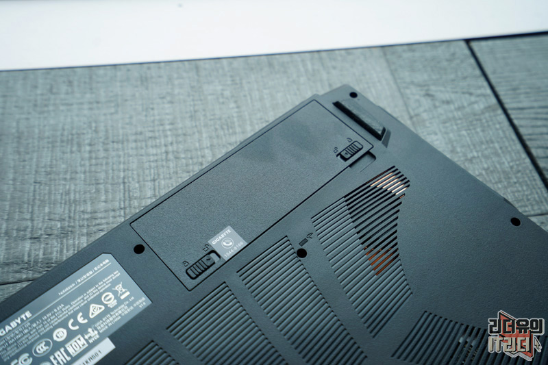 기가바이트 G5 KC i5 바닥면 모습입니다. 공기가 잘 순환 될 수 있도록 촘촘하게 구멍을 만들어 두었습니다. 그리고 독특한 점이 한가지 있는데요.