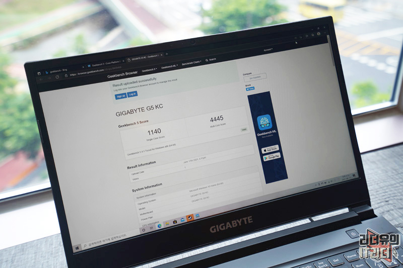 전체적인 성능 점수로 비교가 되는 기가바이트 G5 KC i5 긱벤치5 점수는 싱글코어 1140점, 멀티코어 4445점 입니다. 고사양 노트북으로 충분히 검증이되는 벤치마크 점수입니다.