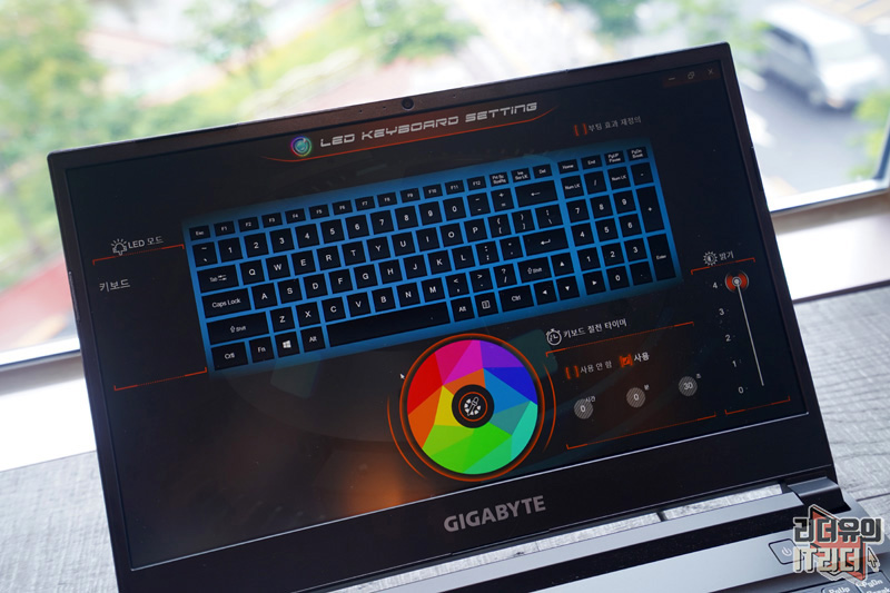 그리고 기가바이트 게이밍 노트북 답게 RGB 키보드로 15가지 컬러 선택을 할 수 있다는 것입니다. 게이밍 노트북은 화려한 노트북 환경도 중요하게 여겨지고 있는데 이런 게이머들의 니즈도 충분히 반영하고 있습니다.