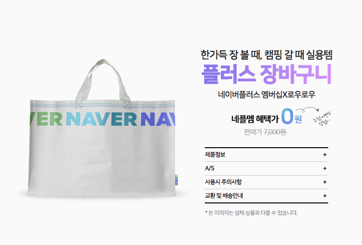그리고 네이버 플러스 장바구니도 있습니다. 네이버도 최고의 브랜드가 된 만큼 장바구니도 하나 가지고 있으면 좋겠죠. 가격은 7,000원 짜리이고 무료로 증정합니다. 장바구니는 무려 9만명에게 제공합니다. 확률이 높네요~