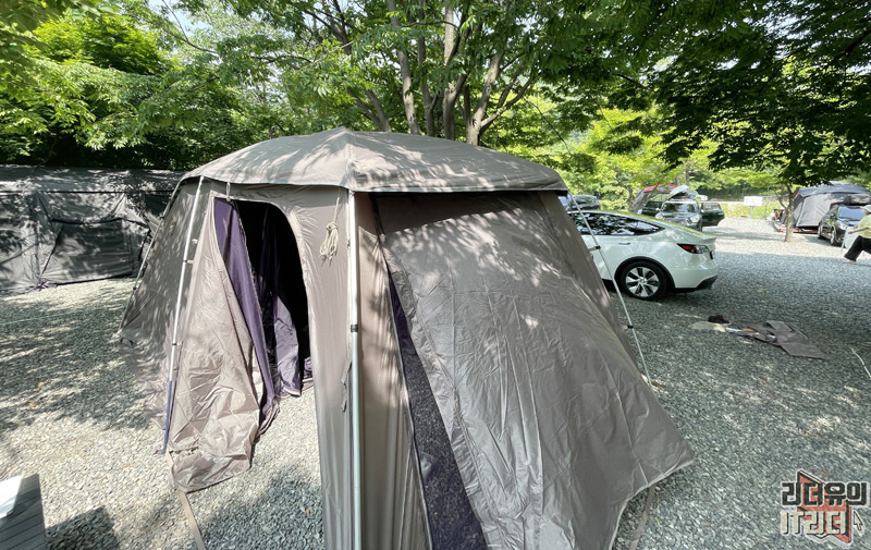 앞에 나무가 있어 텐트를 옆으로 쳤는데 옆으로 출구를 내는 것도 괜찮았습니다. 동선이 짧은게 매력적입니다.