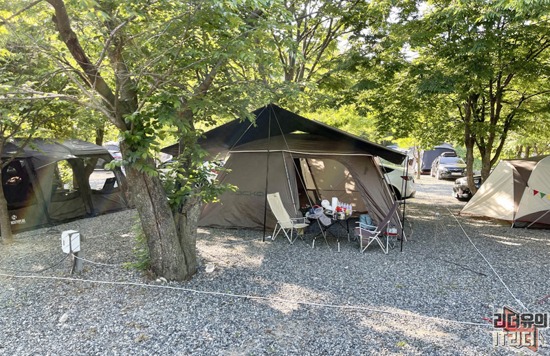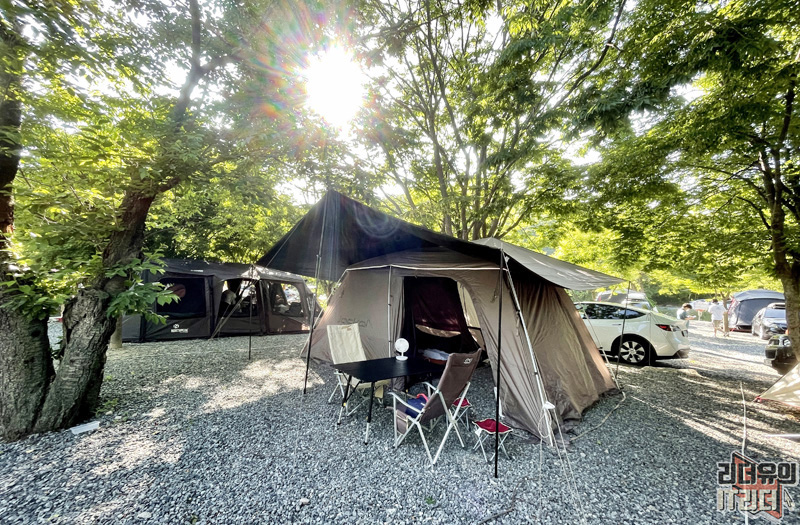 캠핑장에서의 아침 시간! 쟈칼 쉘3 아늑한 공간에서 4인 가족 편안하게 쉬고 재미있는 추억을 만들었습니다.