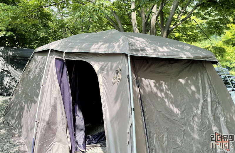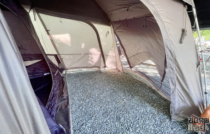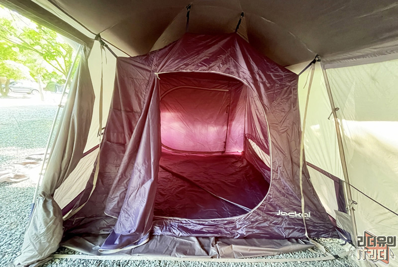 이렇게 절반 영역을 나눠서 침실과 전실을 구분할 수 있어 여유로운 사용을 할 수 있습니다. 투룸텐트가 좋은 점은 밤에도 실내 공간 활용이 가능하고 짐을 두기에도 좋아서 여유로운 캠핑이 가능합니다.