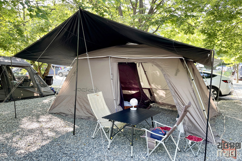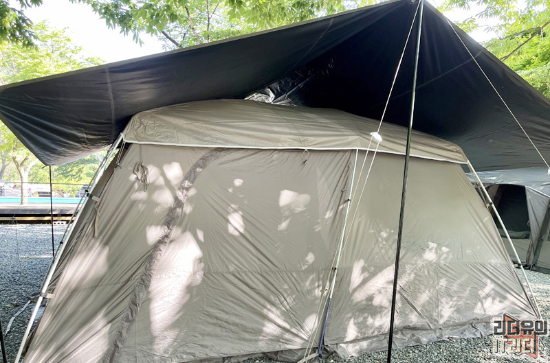 물론 요즘같이 더운 날은 이렇게 타프를 위에 다 쳐주면 더 넓은 공간을 시원하게 쓸 수 있어서 좋습니다. 이중으로 보호되는 느낌이라 열을 확실히 차단 할 수 있어 좋습니다.