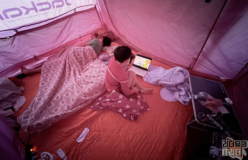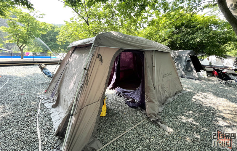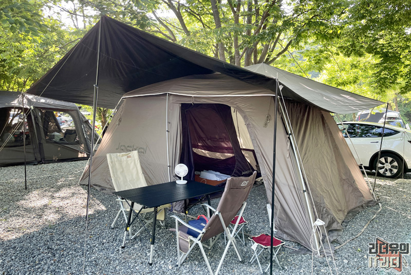 캠핑장에서의 아침 시간! 쟈칼 쉘3 아늑한 공간에서 4인 가족 편안하게 쉬고 재미있는 추억을 만들었습니다.