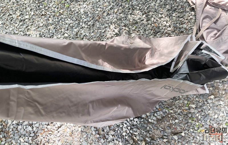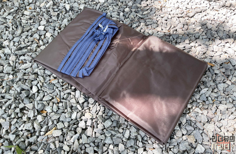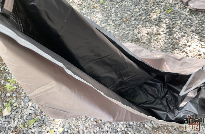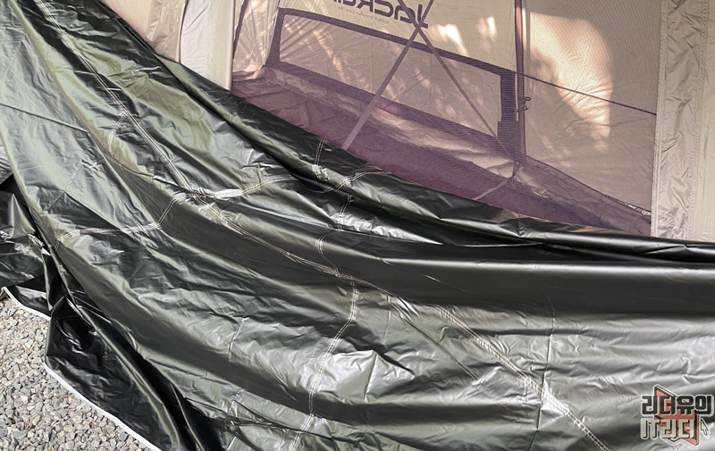 그리고 쟈칼 쉘3 텐트는 구성품에 이런 방수포 같은게 있는데요. 바로 루프 플라이 입니다. 보통 텐트 위에 타프를 치는데 이건 타프를 안치고도 블랙코팅이 된 루프플라이로 차광률을 높여주는 것입니다. 안쪽에 보면 블랙코팅으로 처리된 걸 확인할 수 있습니다.