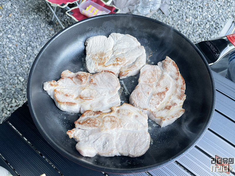 캠핑의 묘미는 먹거리죠~ ^^ 저는 화로보다 이렇게 후라이팬을 더 좋아합니다. ^^ 고기가 타는게 싫어서요~