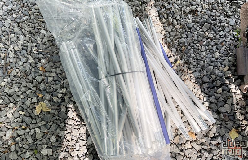 초보 캠핑을 갔을때 당황스러운 건 이 폴대 들이죠? 뭔가 복잡해 보이는 쇠막대들 하지만 어려울 건 없습니다. 실버로 된 2개의 긴 막대들을 X자 형태로 넣어주고 가운데 보라색 폴대 영역만 껴주면 끝입니다.