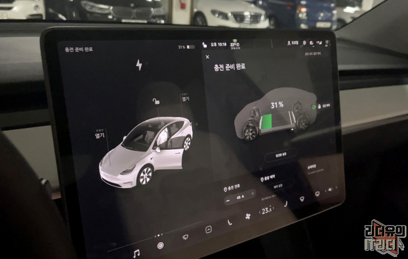 테슬라 모델Y 스크린에도 충전 준비 완료라고 표시가 나옵니다.