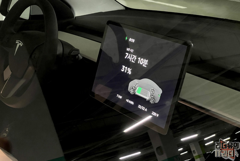 테슬라 화면에 이렇게 충전 중임을 보여주고 있습니다. 완속 충전의 경우 7kW로 충전이 되고 31%에서 90%까지 7시간 10분이 걸린다고 나와 있습니다.