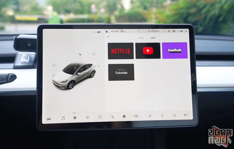 하지만 테슬라 모델Y는 전기차이기 때문에 공회전이라는게 없습니다. 에어컨을 켜도 되고 전기를 마음껏 사용해도 됩니다. 원래가 전기를 사용하는 것이기 때문에 아무런 제약 없이 넷플릭스를 볼 수 있습니다. 그리고 무엇보다 좋은 점은 차안의 좋은 스피커를 사용해서 보기 때문에 극장 같은 분위기를 느낄 수 있습니다.