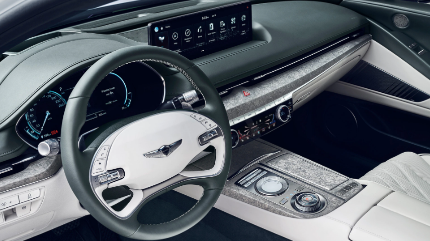 제네시스 G80 전기차 실내는 다크 라군 그린과 글레이셔 화이트 투톤을 더해 화사한 디자인을 보여주고 있습니다. 그리고 친환경 가치를 담아 천염염료를 사용한 나파 가죽 시트, 친환경 원목장식인 포지드 우드(forged wood) 가니쉬 등으로 새로움을 주고 있습니다. 그리고 14.5인치 인포테인먼트 시스템이 들어가 첨단 이미지를 더하고 있습니다.