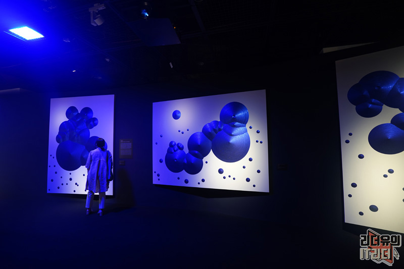 그리고 올레드 사이니지 20대를 붙여 만든 대형 비디오월을 통해 관람객들에게 전시 관련 이미지를 생생한 화질로 제공하고 있습니다. 배젤이 거의 없이 연결된 화면으로 웅장한 이미지와 함께 전시회의 품격을 올려주고 있습니다.